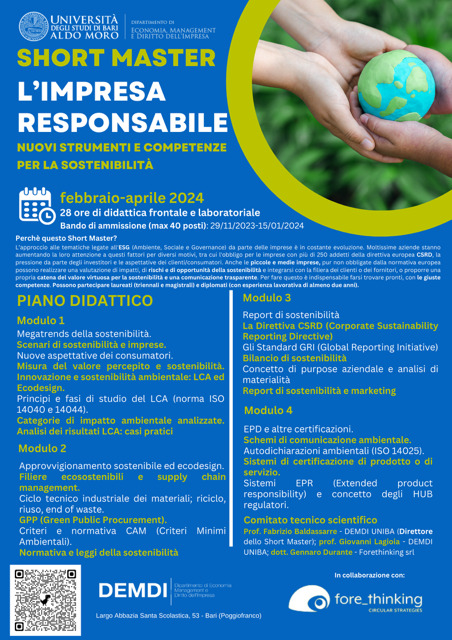 Short Master “L’IMPRESA RESPONSABILE: NUOVI STRUMENTI E COMPETENZE PER LA SOSTENIBILITÀ” a cura di Dipartimento di Economia, Management e Diritto dell’Impresa, Università degli studi “A. Moro” Bari e Forethinking Srl Società Benefit.
