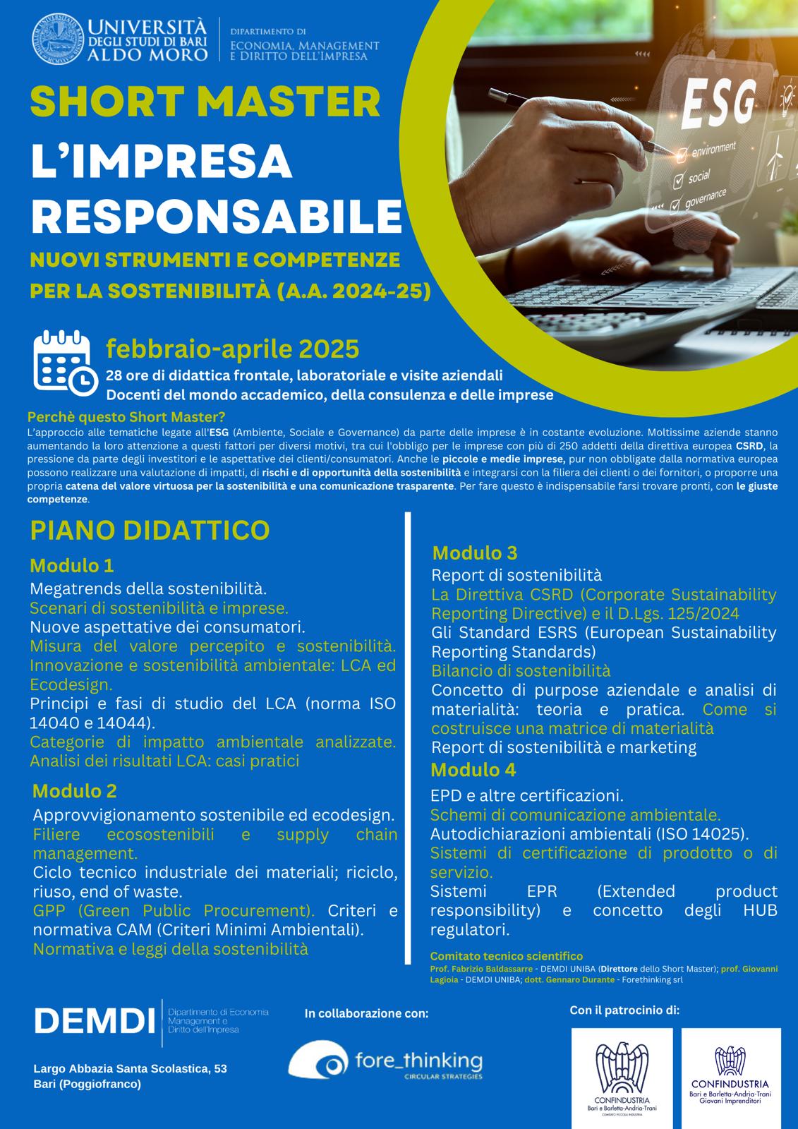 Organizzato in collaborazione tra Forethinking Srl e il Dipartimento di Economia, Management e Diritto dell’Impresa (DEMDI) dell’Università degli Studi di Bari “Aldo Moro”, lo Short Master è patrocinato da RSM Italy, dal Comitato Piccola Industria e dal gruppo Giovani Imprenditori di Confindustria Bari e BAT. Questa sinergia garantisce un’offerta formativa di alto livello, caratterizzata da un approccio multidisciplinare e da docenti esperti in ambito accademico e imprenditoriale.